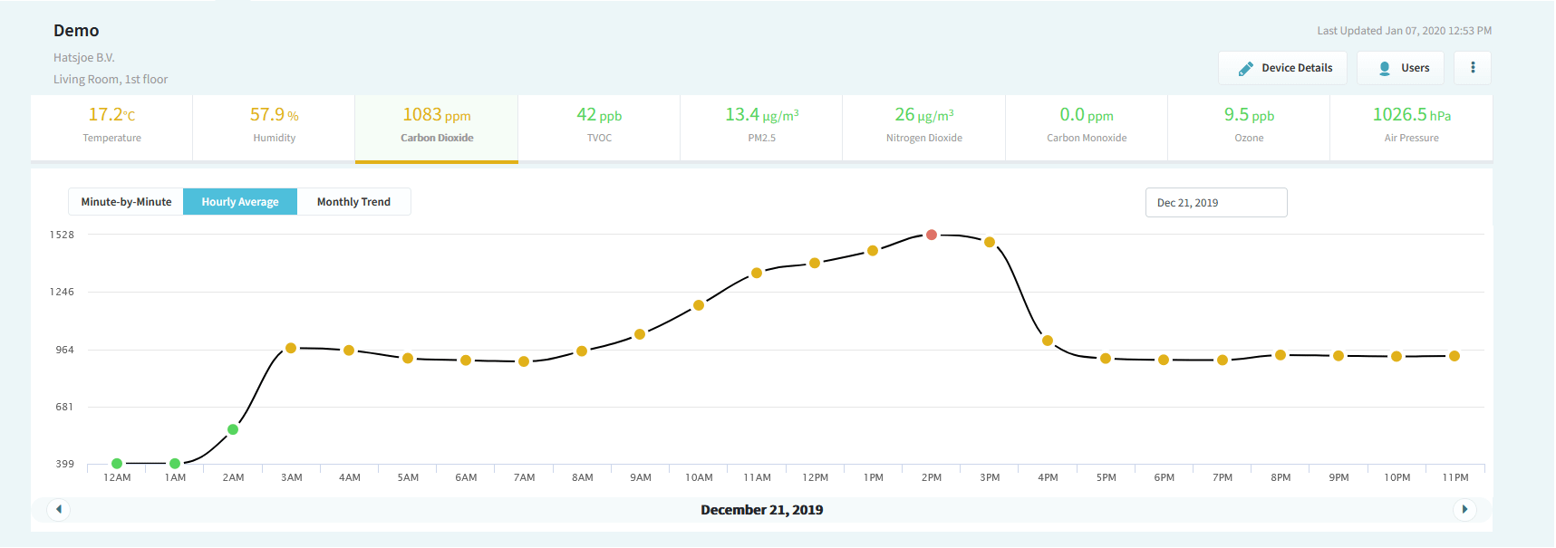 Met deze sensor meet u de luchtkwaliteit middels 9 verschillende waarden in de lucht: temperatuur, relatieve vochtigheid, luchtdruk, CO2, VOS, PM2.5, CO, NO2 en ozon. De metingen zijn altijd actueel te bekijken op een mobiele applicatie en een online dashboard.